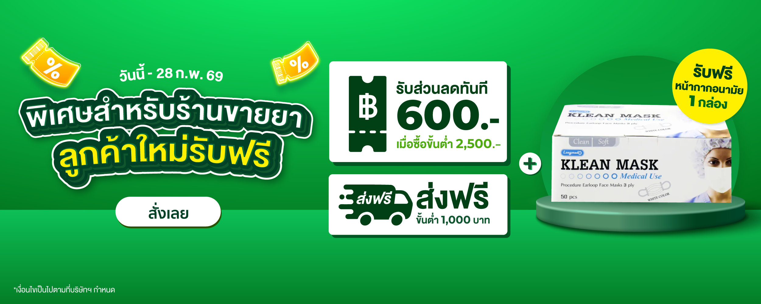 - ออเดอร์แรก รับส่วนลด 600 บาท เมื่อซื้อขั้นต่ำ 2,500 บาท พร้อมรับฟรี หน้ากากอนามัย Klean Mask 1 กล่อง (50 ชิ้น)