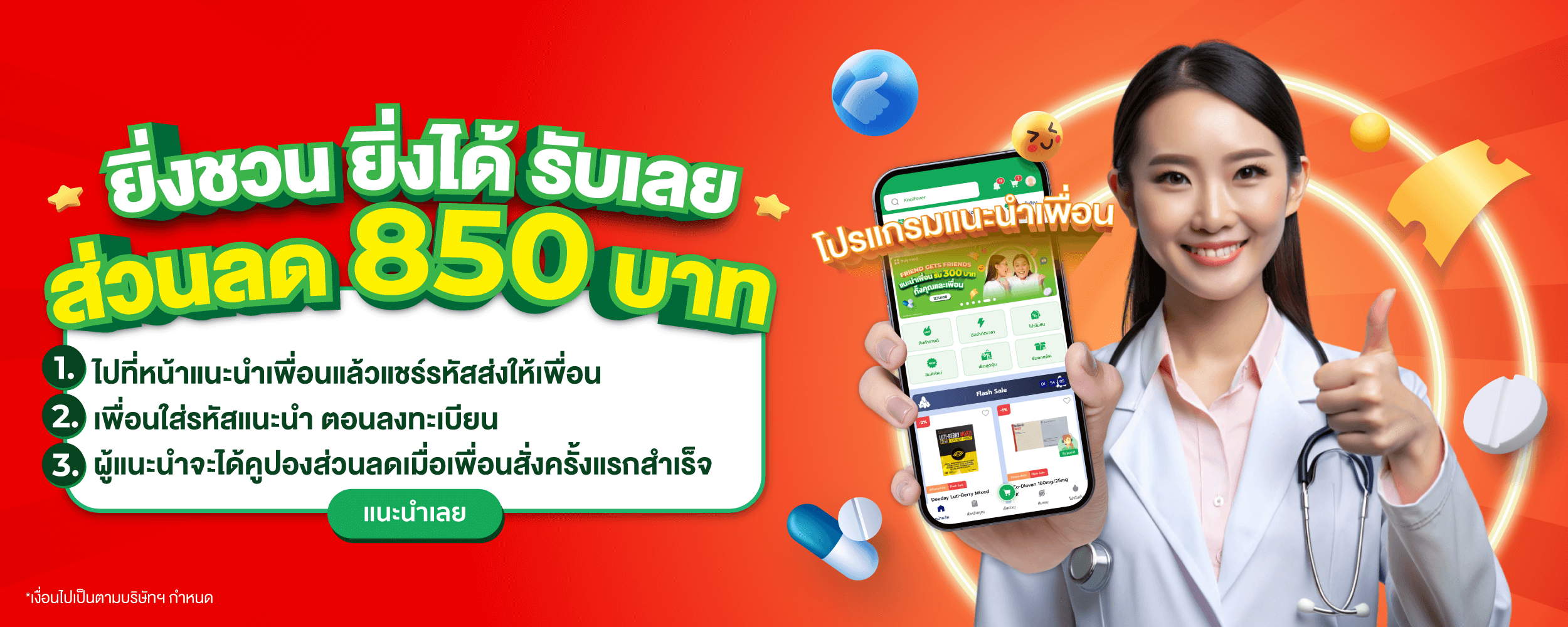 - คำสั่งซื้อแรกของผู้ถูกแนะนำต้องมียอดสั่งซื้อขั้นต่ำ 2,500 บาทต่อบิล จึงจะสามารถใช้ส่วนลดได้