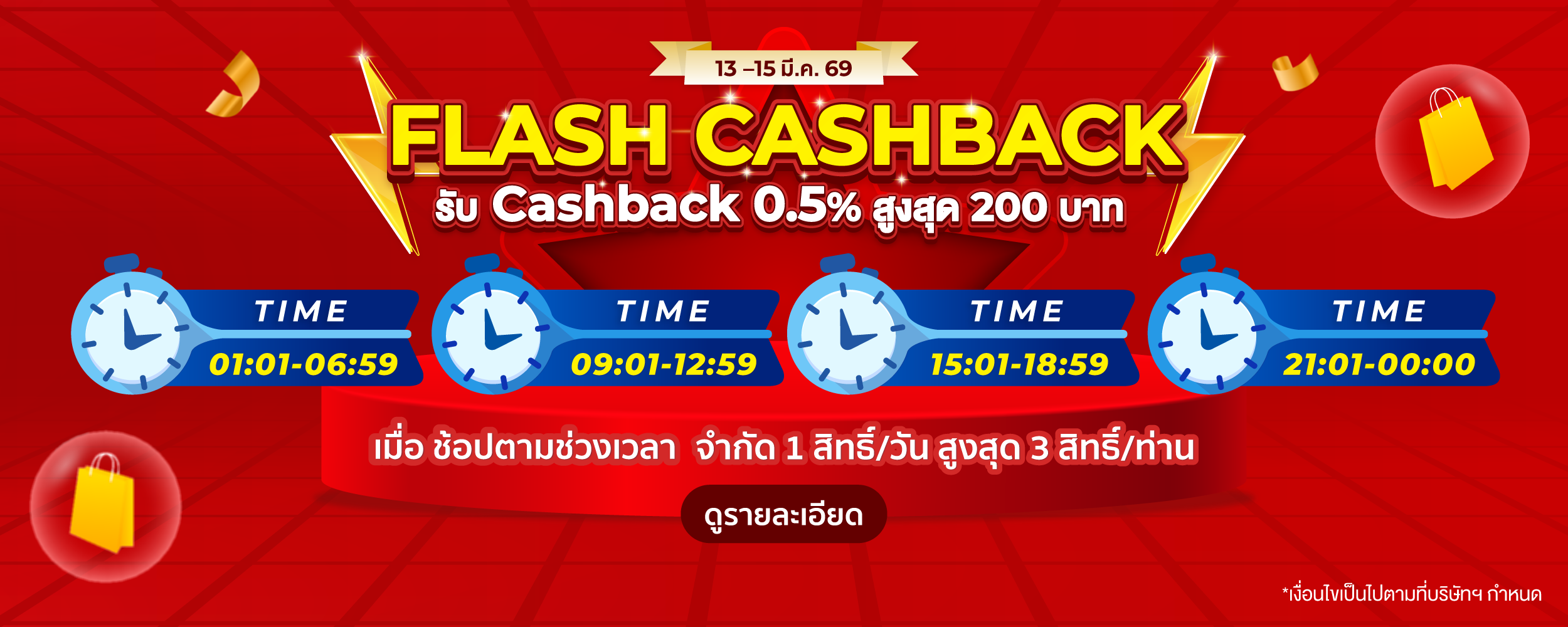 ลูกค้าจะได้รับ Cashback 0.5% สูงสุด 200 บาท เมื่อสั่งซื้อสินค้าในช่วงเวลา 01:01–06:59 | 09:01–12:59 | 15:01–18:59 | 21:01–00:00 ระหว่างวันที่ 13 – 15 มี.ค. 2569